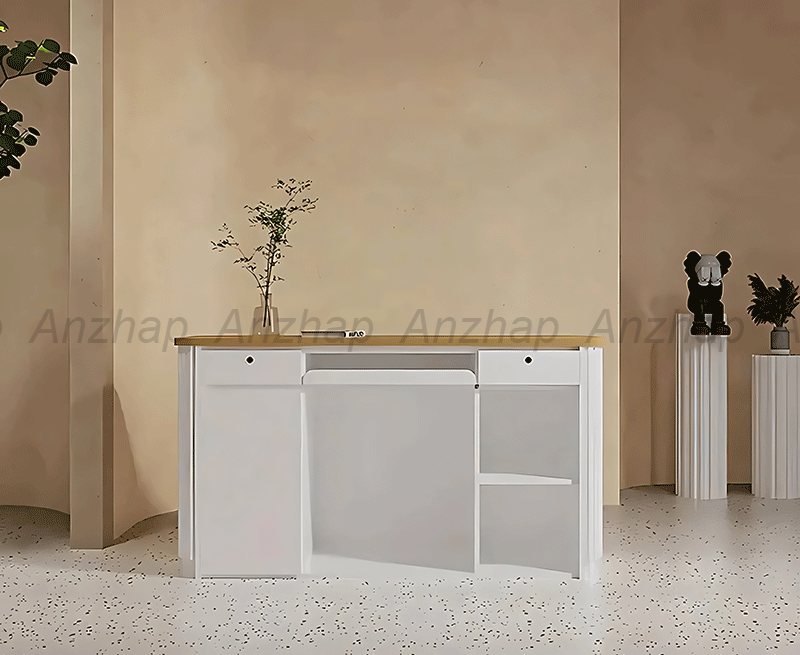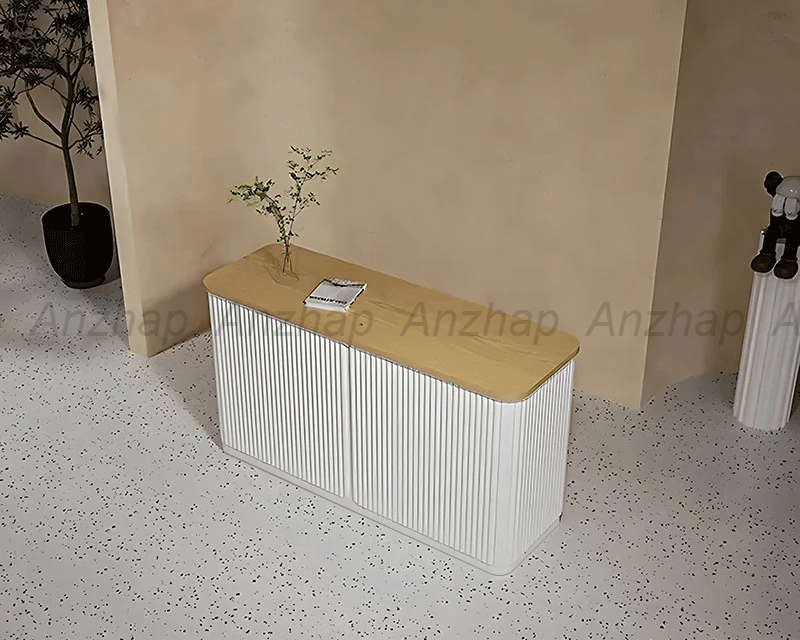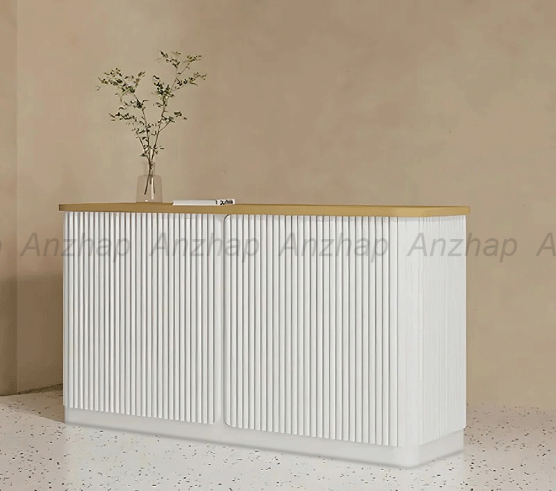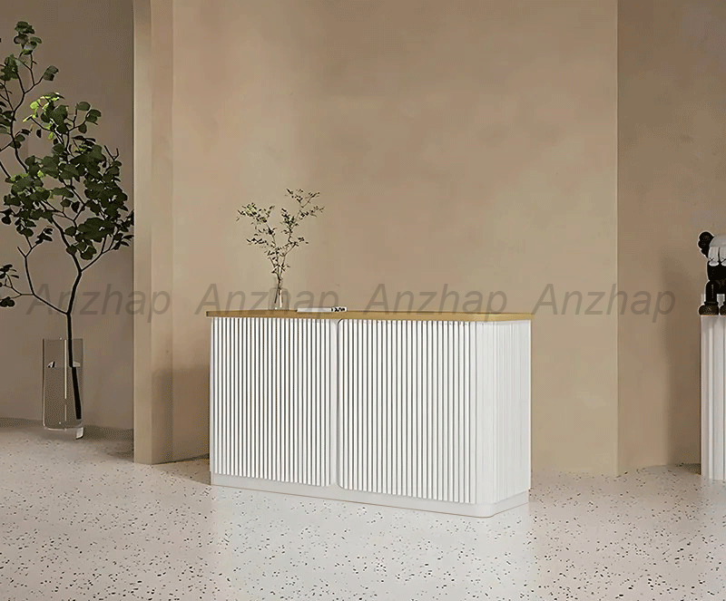 This minimalist reception desk is perfect for upscale boutiques, fashion stores, and beauty salons. Featuring a sleek round wood rod design, it combines modern style with practicality. Made from E1 grade environmentally friendly high-density board, it offers durability, sturdiness, and is odorless. The natural wood grain finish adds elegance with its unique textures and tones, enhancing visual appeal. Choose this reception desk to make a stylish first impression and create a welcoming atmosphere for your clients.
