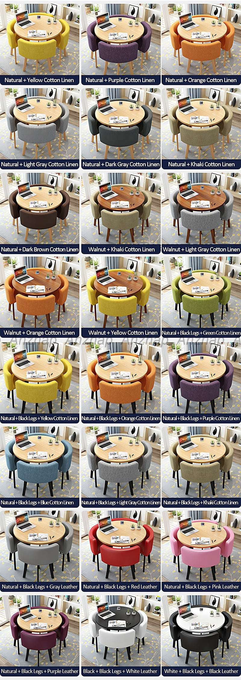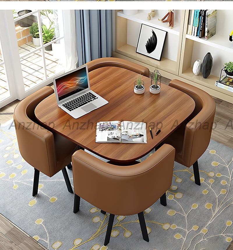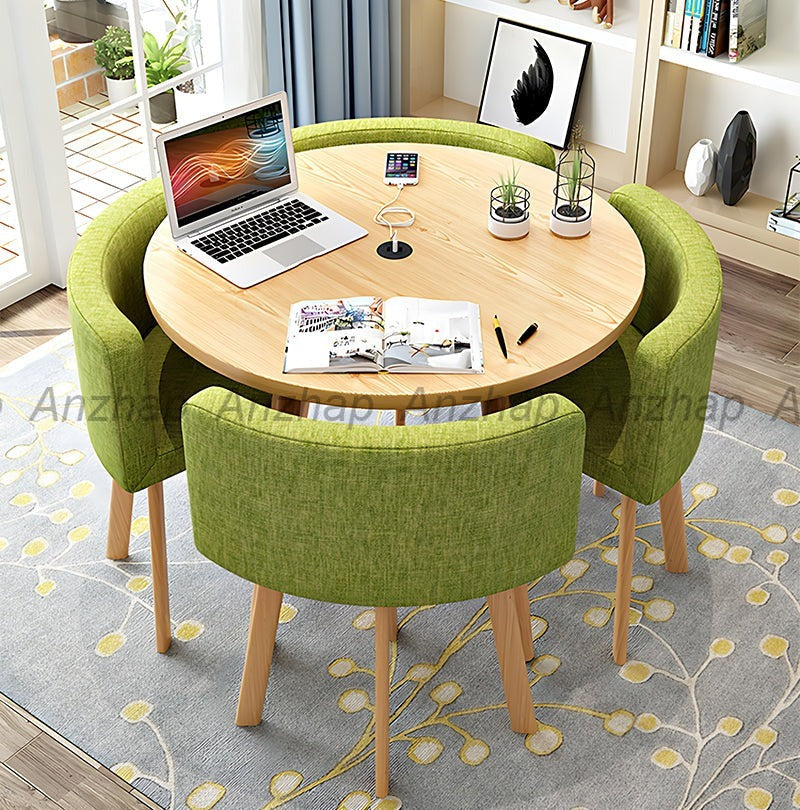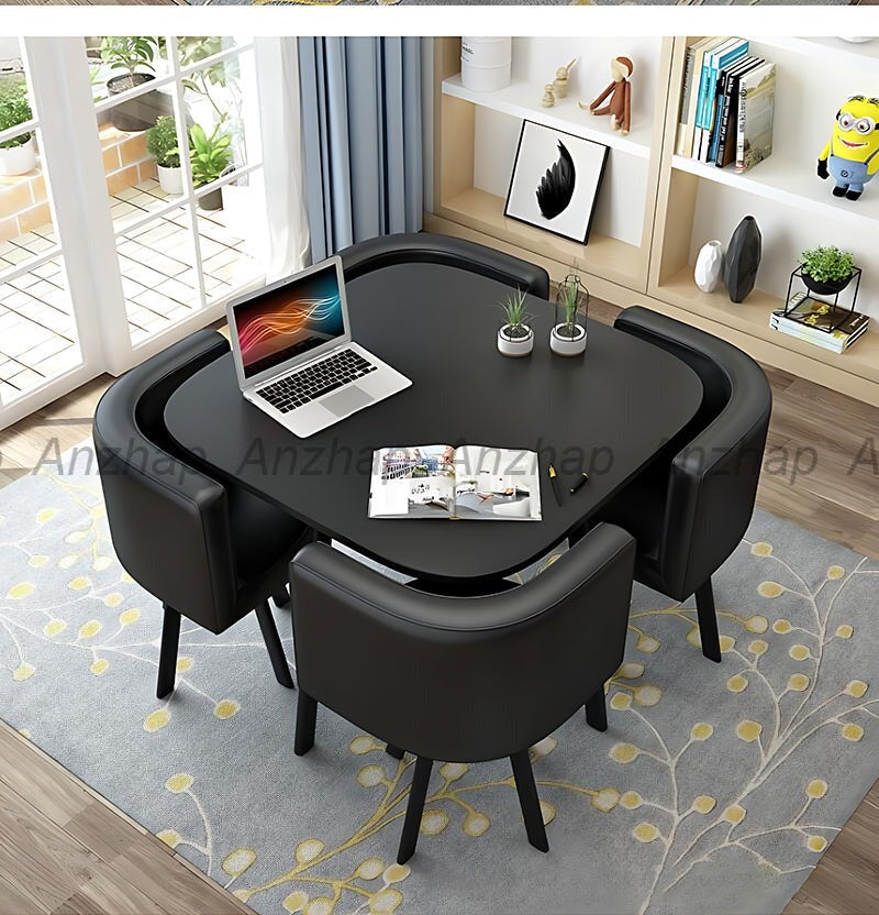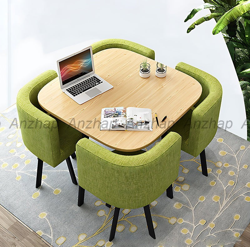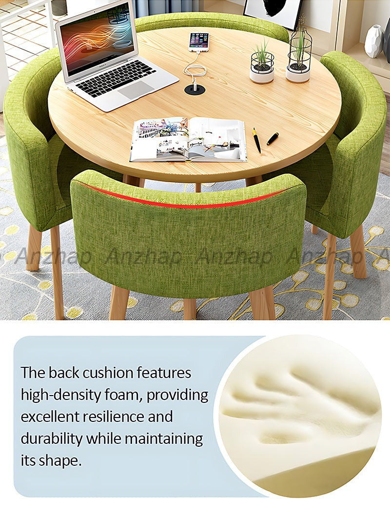 The sleek table and chair set, featuring rounded anti-collision corners for safety. The thick E1 high-density board tabletop is strong, odor-free, and easy to clean. Chairs are upholstered in breathable cotton and linen fabric with high-density rebound sponge for ultimate comfort. Both table and chair legs are made of sturdy iron with non-slip mats to protect floors and reduce noise. Perfect for offices, restaurants, lounges, conference rooms, reception areas, and others.